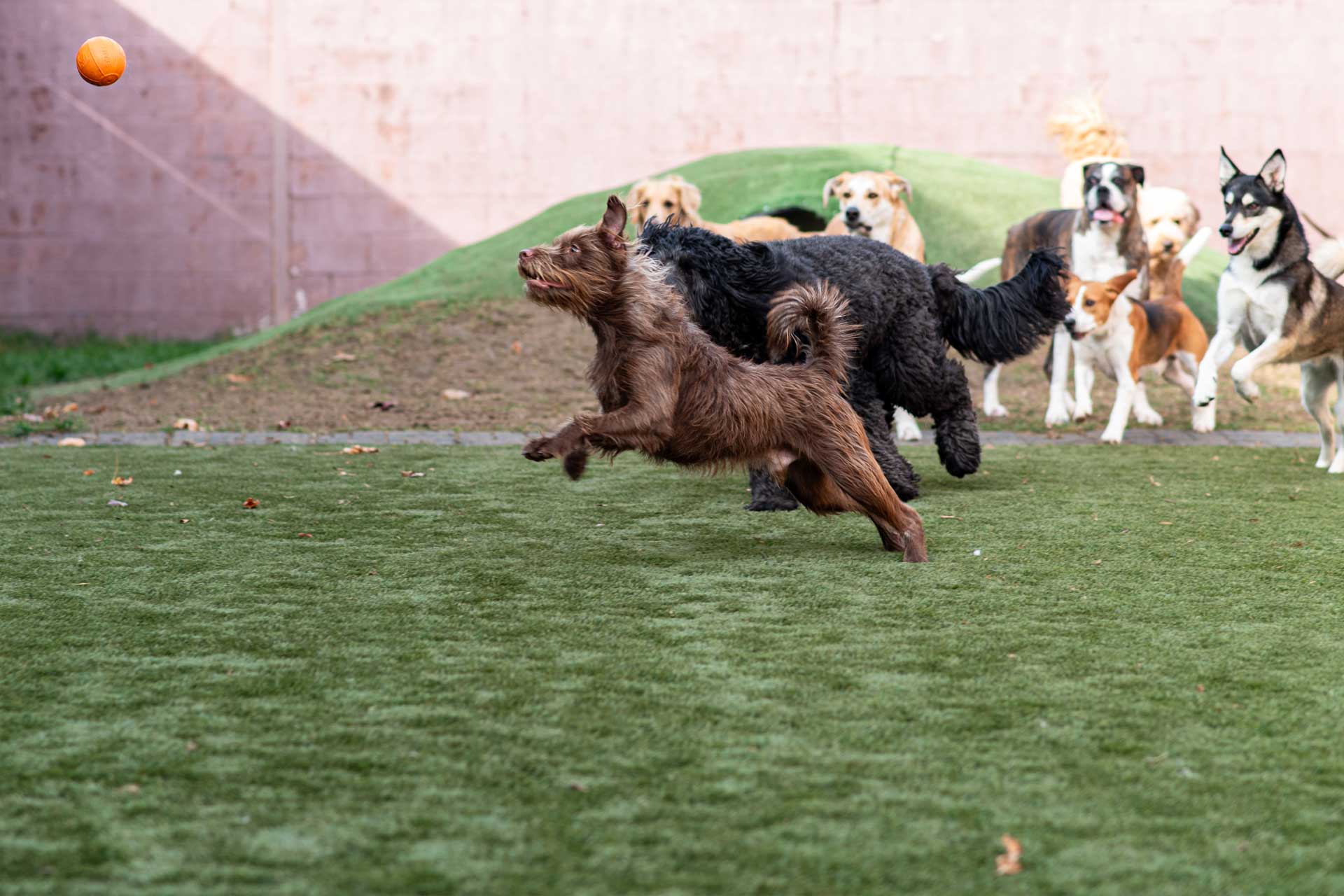 Our Dog Daycare accommodates up to 40 dogs and accepts new clients after a temperament test.